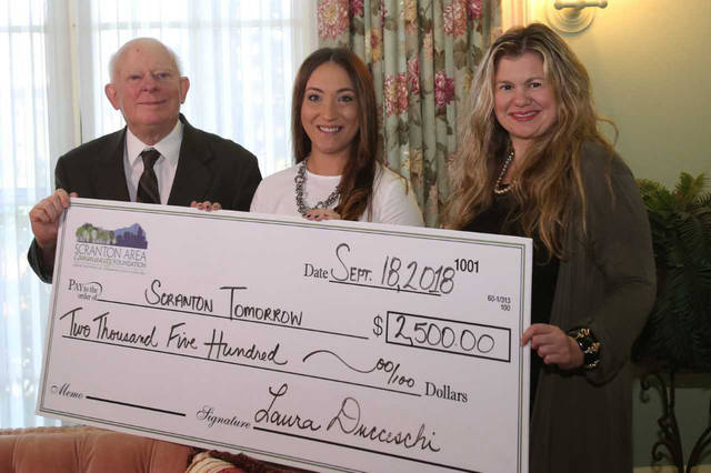 Scranton Tomorrow, on behalf of the Governor’s Arts Awards Committee, accepted grant funding from the Scranton Area Foundation (SAF) in the amount of $2,500. Scranton Tomorrow served as the fiscal institution in order to aid the committee in the administration and reporting of sponsorships and grants activities. While planning the activities for the awards ceremony held Aug. 8, Scranton Tomorrow and committee members partnered with existing arts and cultural organizations in order to highlight their contributions to Scranton’s arts community. Scranton Tomorrow’s mission is to establish the downtown business district of Scranton as a driving force in fostering and supporting economic revitalization utilizing the five-point approach including organization, design, economic revitalization, promotion and safe, clean and green. From left, Alan Hughes, SAF Board Member; Elizabeth Baldi, Scranton Tomorrow Project Coordinator; and Laura Ducceschi, SAF President/CEO.