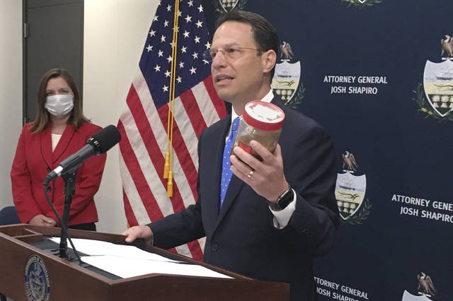 Pennsylvania Attorney General Josh Shapiro, right, holds a jar of discolored tap water during a news conference on Thursday in Harrisburg. He said the sample was from the home of a state resident whose well had been tainted by nearby natural gas drilling. Shapiro released results of a two-year grand jury report that blamed state regulators for not doing enough to protect Pennsylvanians from the health and environmental effects of hydraulic fracturing, or fracking.