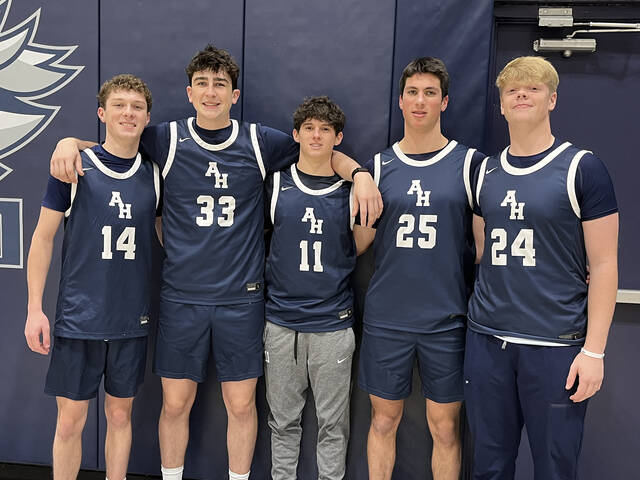Representing the Abington Heights boys basketball team at Coaches vs. Cancer Media Day were, left to right, Andrew Kettel, Jordan Shaffer, Chris Begley, Finn Goldberg, and Ben Reese.