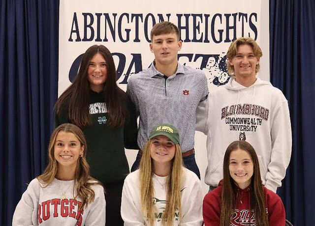 Among the Abington Heights athletes signing NCAA Athletic Aid Agreements in November were, from left, first row: Lilia Calvert, Hawley Lynott, and Allie Rothenberger. Second row: Kylie Kehoe, Nick Bradley, and Philip Mathews.