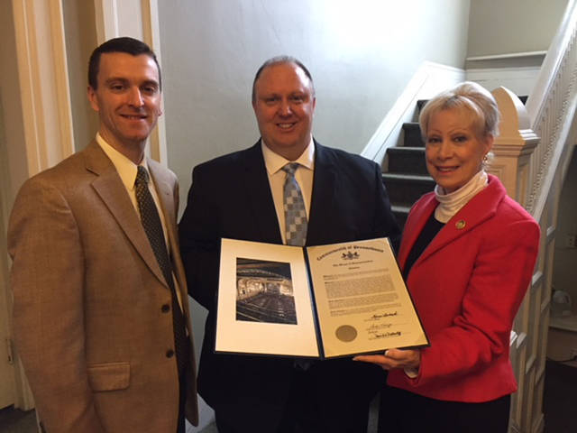 State Representative Karen Boback presented a citation from the House of Representatives to recognize the Lackawanna Trail football team on winning the PIAA District 2 “A” Championship. From left, are Lackawanna Trail Junior-Senior High School Principal Dr. Mark Murphy, Lackawanna Trail Superintendent Matthew Rakauskas, and Rep. Boback.